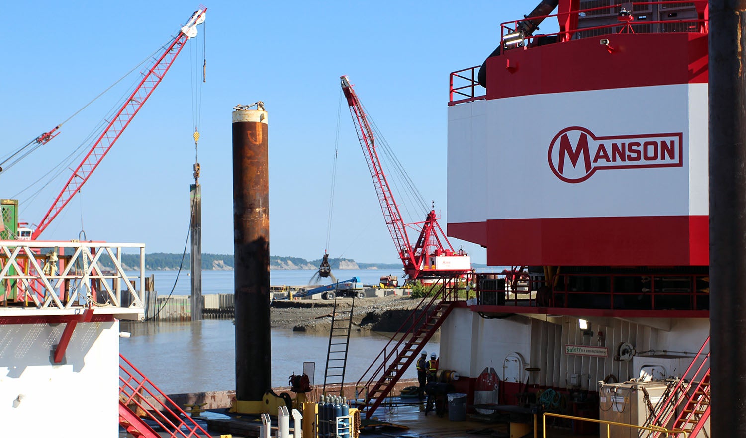 The HDR construction administration team managed challenging conditions throughout Phase 1 of the project. In 2020, we oversaw the installation of 71 48-inch-diameter piles for the new Petroleum and Cement Terminal foundations and approaches. In 2021, nine 144-inch-diameter mooring and breasting dolphin piles were installed, weighing 255 to 311 tons each. This work was completed in an environment with around 30-foot tides twice daily — the fourth largest in the world. These tides impacted pile installation, generated extreme currents and affected the elevation of work barges. The superstructure of the terminal was assembled using precast concrete blocks connected with massive cast-in-place concrete pours. Both the piling and the superstructure were supported by templates and falsework to support these permanent works.