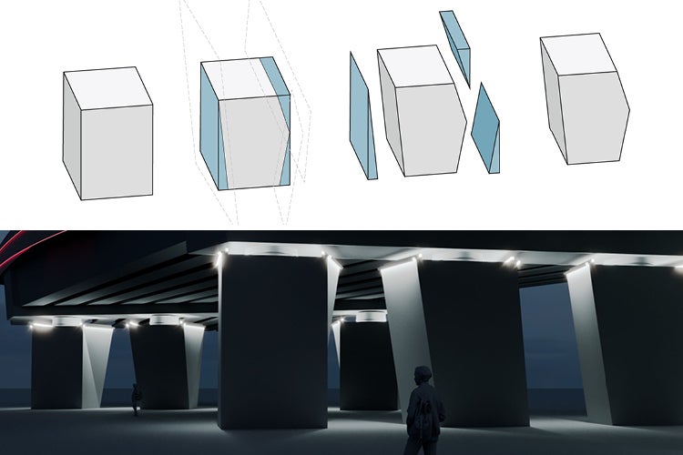The client wanted a non-repetitive design where the form was integral with the structure while also being cost-efficient and contractor friendly. After many design iterations and concepts, we decided to explore the architectural philosophy known as subtractive architecture. Applied to this project, we envisioned a solid pier wall with sections carved out — similar to the separation of tectonic plates.