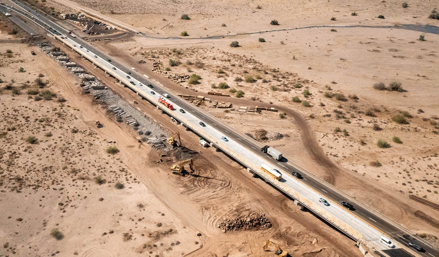 - I-10 Bridges Over the Gila River – Replacement of existing two-lane river bridges with wider three-lane bridges, full-width shoulders, updated approaches and deeper foundations